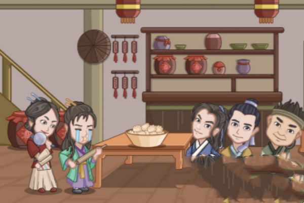 1、把大蟠桃和粥移动至给右边的客人,带领大家一起摇头。