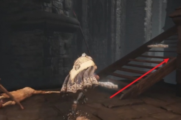 2、沿着楼梯到达上面的房间并从里面的门走出去,从那里下楼梯。