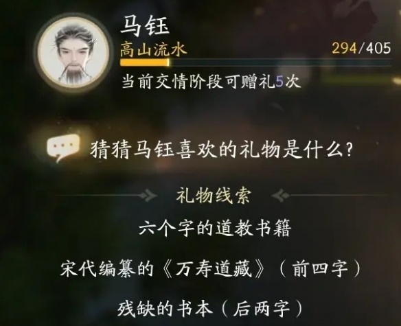 射雕游戏中,马钰喜欢的礼物可以通过解锁谜题来进行选择物品,送出相对应的礼物可大大提升侠侍与角色的好感度,从而快速在门派中取得绝世武学,其中物品需要玩家进行合成或者商城购买。