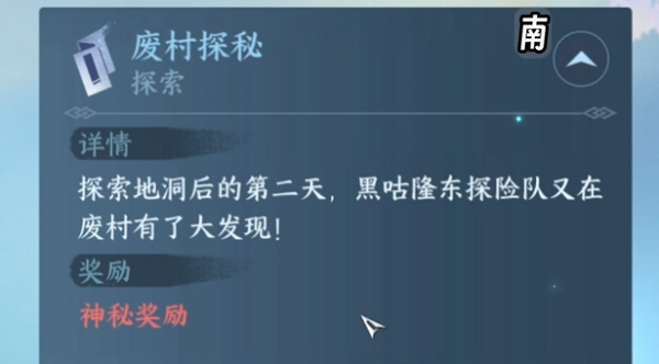 逆水寒手游的桃溪村地图中有一套长线任务,需要在几天中完成他们,在完成第一天的任务地洞奇闻后,第二天的任务就是废村探秘了,完成任务还需要等第三天的任务。