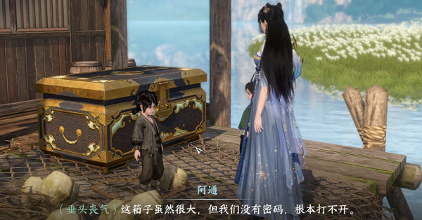 5、然后跟旁边的小孩子对话,得知有个不知道密码的箱子要打开,任务就是找密码了。