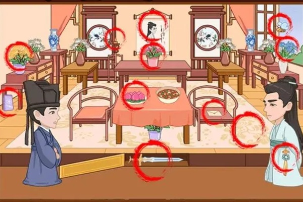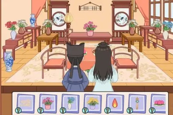 1、把中间的两人拉开找到玉佩,点击桌布找到绿色的花,并移动至红色的花上。